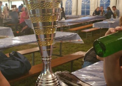 Das Aufwärmen begann schon früh am Samstagmorgen. Nämlich ca. um 08:40 Uhr, als die meisten sich mit dem Fahrrad in Auw trafen und gemeinsam nach Merenschwand radelten. In Merenschwand angekommen starteten dann auch schon früh um 09:00 Uhr die Gruppenspiele. Die Mission nach dem letztjährigen Sieg in der Kategorie B war klar: Heuer wollte man ganz vorne mitmischen. Dieses Jahr wurde das Turnier nicht mehr in Kategorie A und B aufgeteilt, es kämpften sage uns schreibe 40 Teams um den Sieg. Dementsprechend hoch war die Motivation beim ganzen Team. In der Gruppenphase konnten alle Spiele bis auf eines ziemlich klar gewonnen werden. Im einen Spiel gab es ein hoch umkämptes Unentschieden. Dank dem besseren Punkteverhältnis waren wir schlussendlich auf dem ersten Gruppenplatz – der Einzug ins Viertelfinale war perfekt! In den folgenden Finalspielen hatten wir etwas “Spielplanglück”: während sich regelrechte Top-Teams gegenseitig rauskegelten, bekamen wir es mit vergleichbar machbaren Teams zu tun. So fanden wir uns im Finalspiel wieder. Wegen einer zwischenzeitlischen Baisse im zweiten Satz mussten wir über drei Sätze spielen und das bessere Ende war schlussendlich auf unserer Seite. Somit durften wir von 40 Teams zuoberst aufs Treppchen steigen und den monströsen Pokal in die Höhe stemmen – juhuuuui! Wir danken allen mitgereisten Fans, die uns vor allem im Finalspiel lautstark unterstützt haben. Dieser Erfolg wurde bis in die frühen Morgenstunden gefeiert.