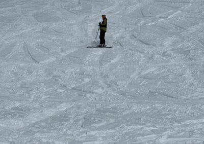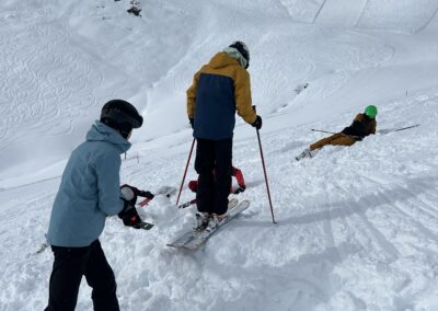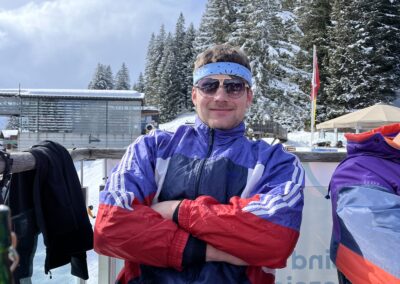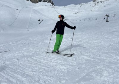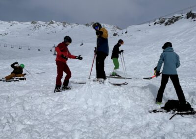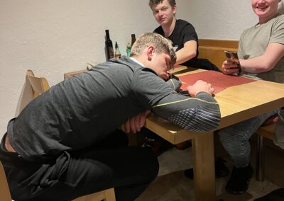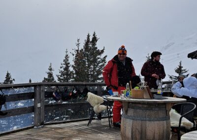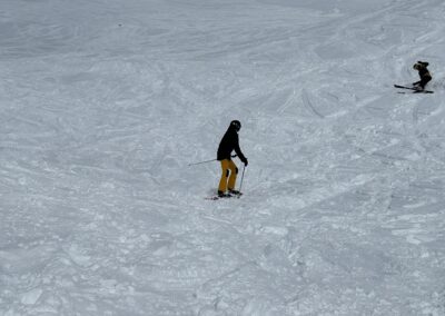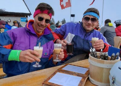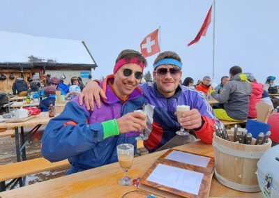 Am Samstagmorgen trafen wir uns um 8 Uhr, um den sonnigen Tag voll auszukosten. Nachdem alle an der Talstation eingetroffen waren, ging es in kleinen Gruppen voller Vorfreude ab auf die Piste. Der Tag wurde mit Skifahren auf und neben der Piste, Schanzen bauen und Schneeschuh laufen verbracht, bevor wir uns gegen halb vier Uhr zum Après-Ski trafen. In geselliger Runde liessen die einten den Tag an der Bar und die anderen bei einer Runde «Hose abe» ausklingeln. Nach dem einen oder anderen Kaffee Luz oder Schoggi Melange gingen die einten vor dem Abendessen sich in der Unterkunft frisch machen und andere kamen direkt in der Skibekleidung in die Pizzeria. Im Anschluss kehrten wir zurück in die Unterkunft und liessen den Abend in der nahen gelegenen Bar ausklingen.