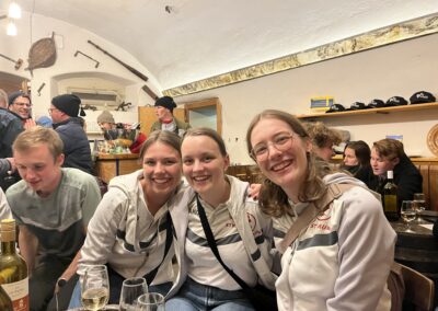 Angekommen in Twann, haben wir die Unterkunft bezogen. Wir waren sehr froh, dass die zweite Gruppe offensichtlich noch nie in einer Zivilschutzanlage übernachtet hat und nicht wusste, dass man sich IMMER das oberste Bett sichern sollte. Kurze Zeit später sassen wir bereits gemeinsam im «Turnerchäller» beim TV Twann und genossen unser erstes Glas Chasselas. Wir verbrachten den Abend in guter und fröhlicher Stimmung und einigen Flaschen Wein im Turnerkeller. Auf dem Nachhauseweg durfte ein Stopp in der Bar natürlich nicht fehlen. Dank der Zeitverschiebung hatten wir sogar eine Stunde länger Zeit zum Schlafen – oder besser gesagt: zum Feiern.