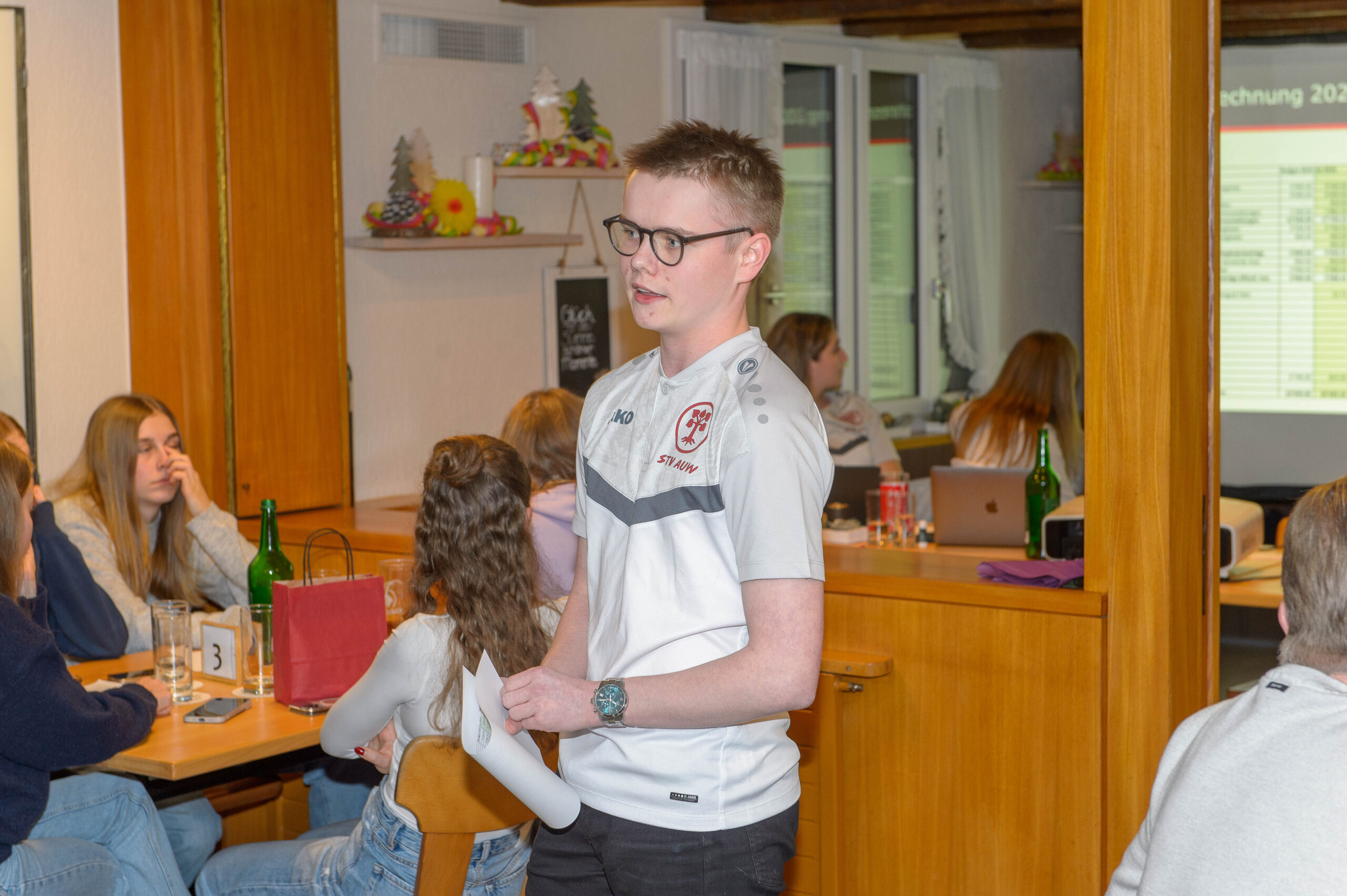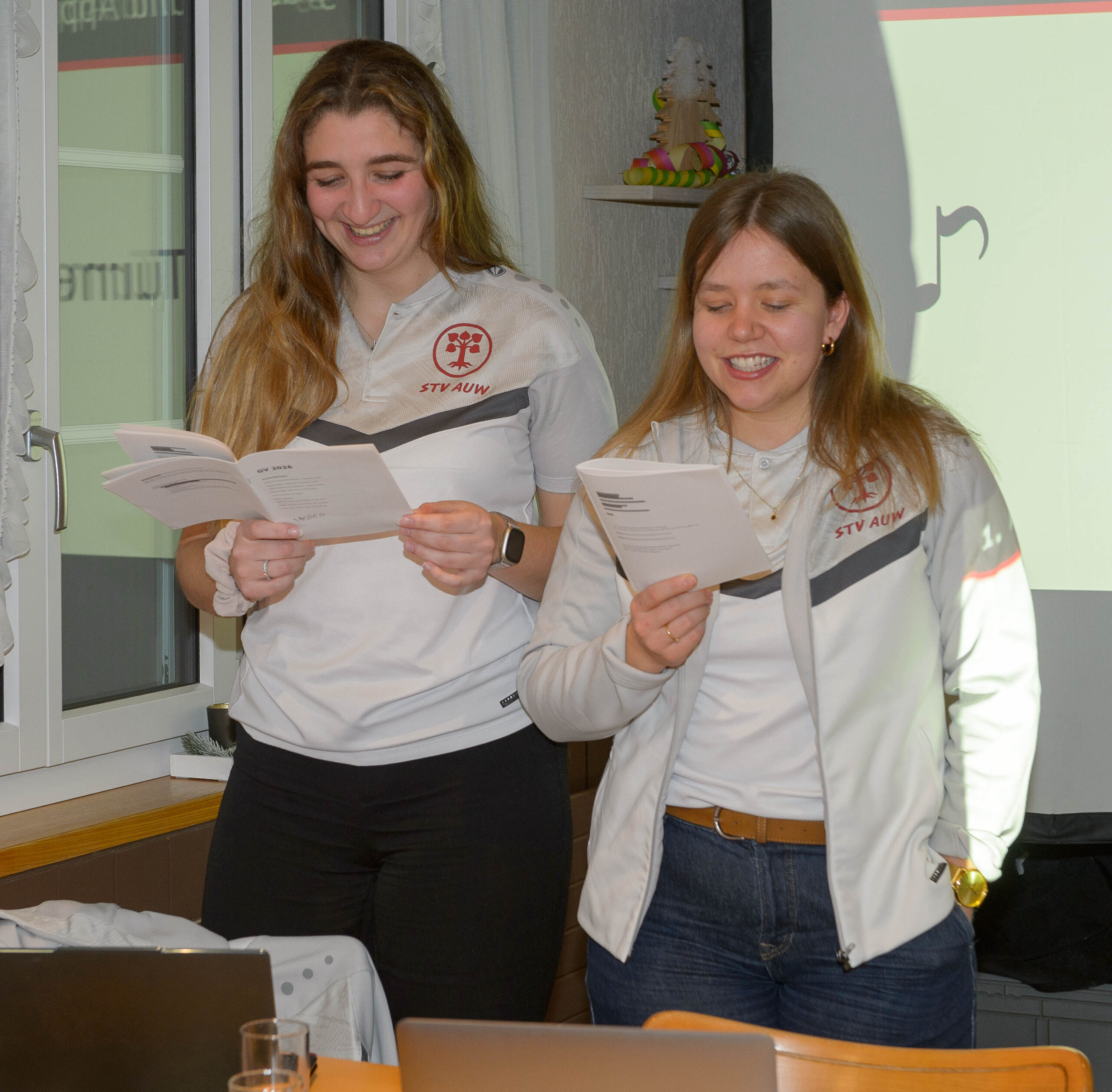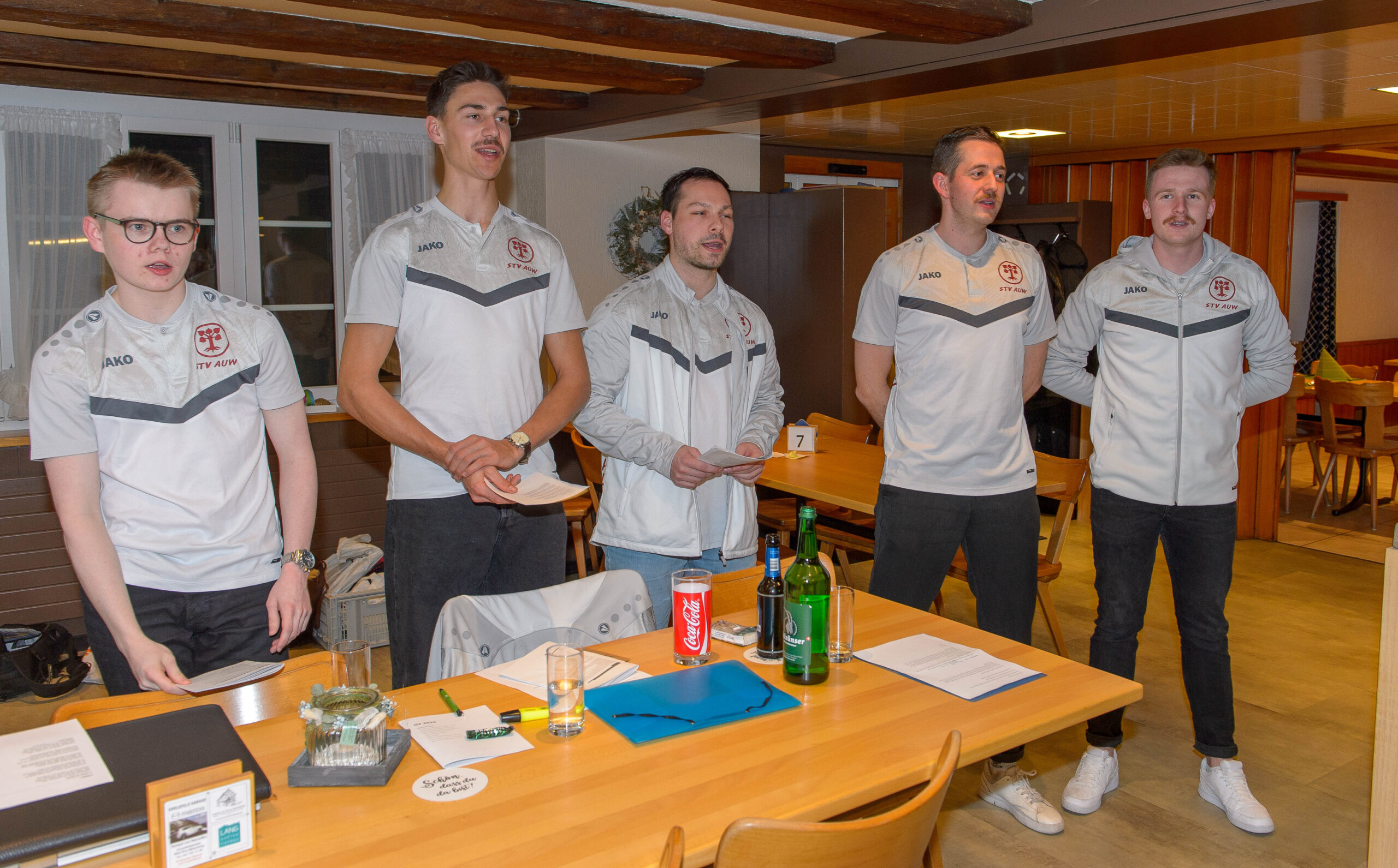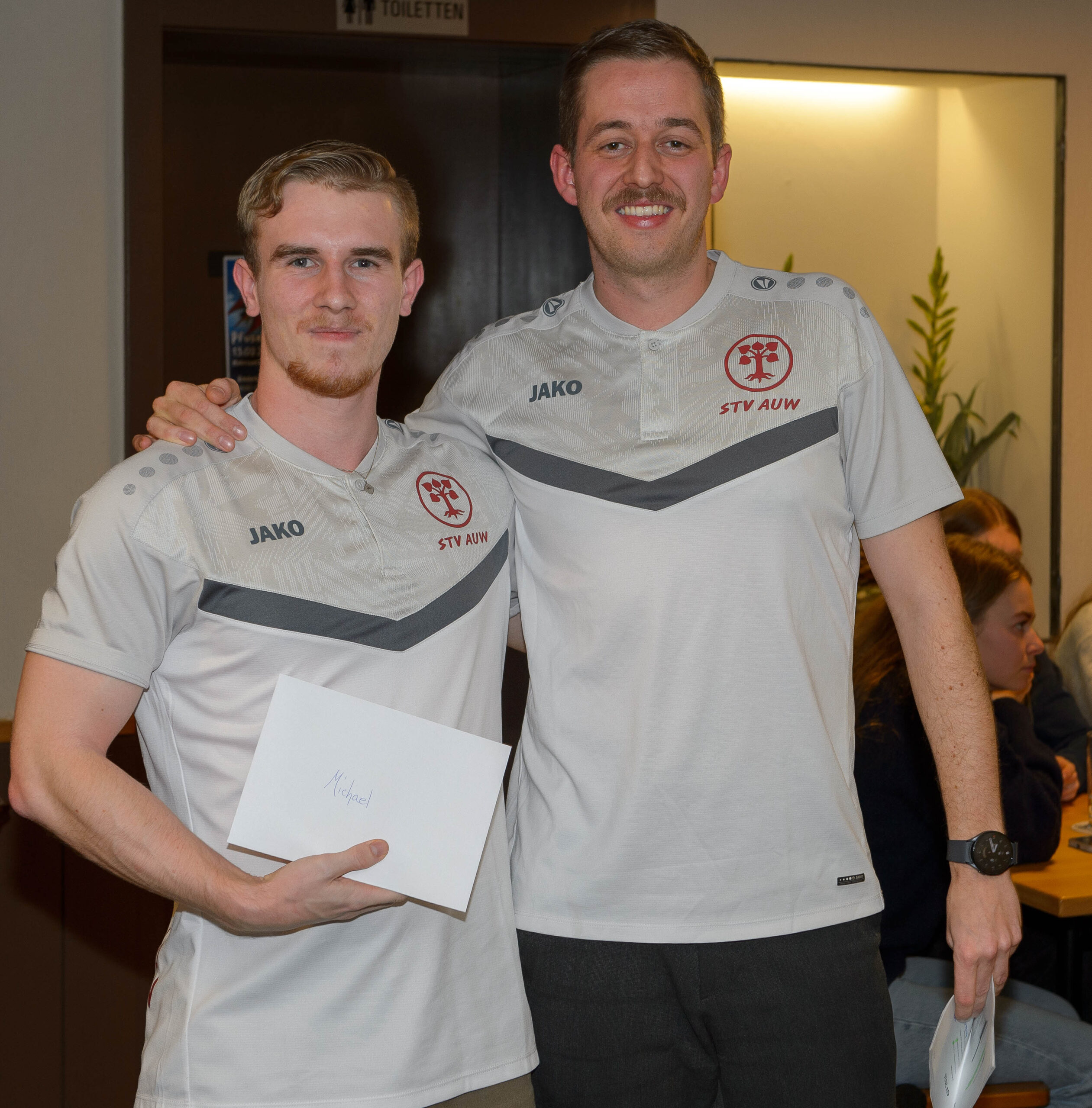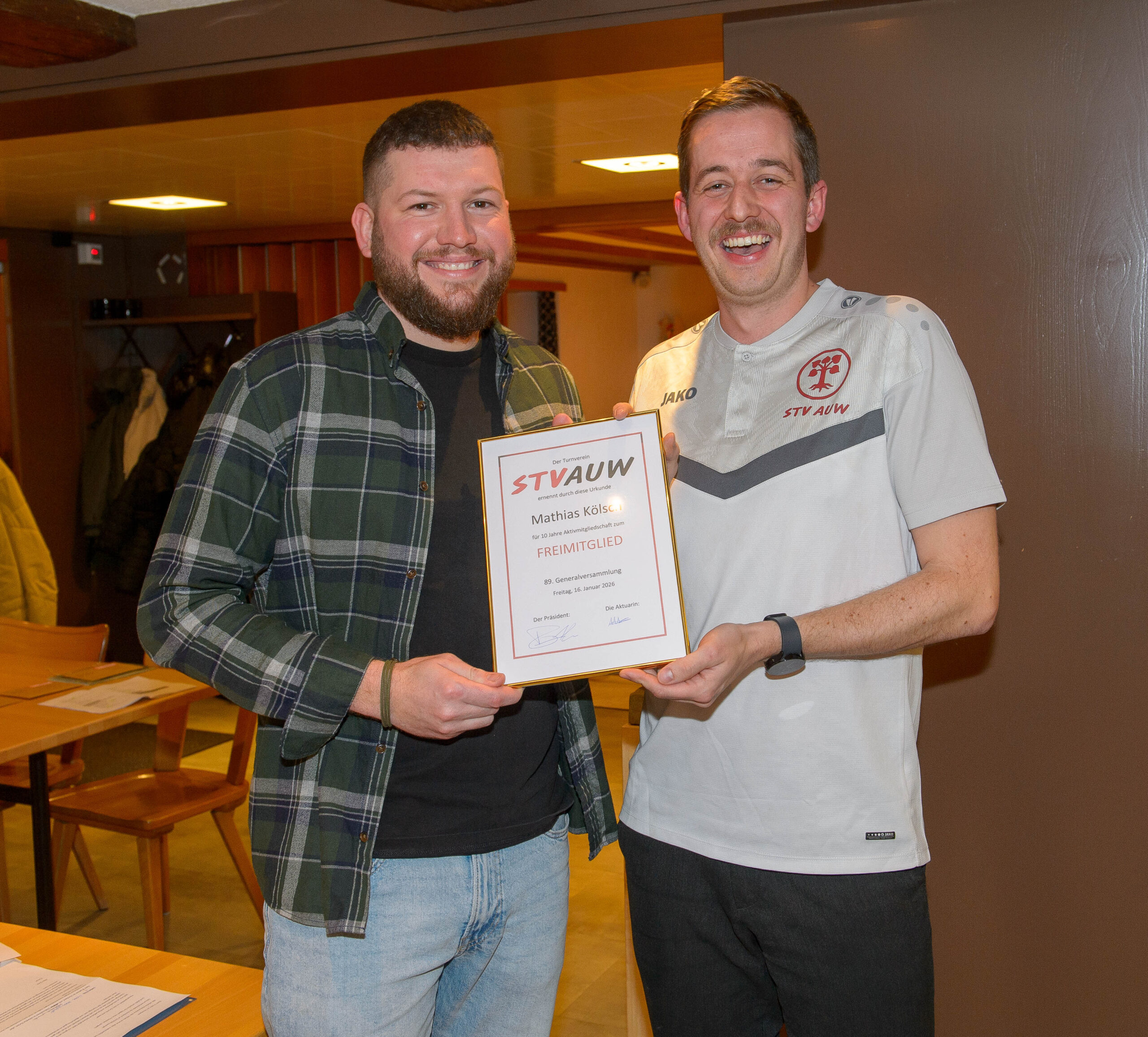 Gesättigt startete danach die GV traditionsgemäss mit dem Turnerlied, lauthals vorgetragen von 61 Personen. Auch wenn sich die jungen Teilnehmer (welche die Hälfte der Teilnehmer ausmachten) noch etwas scheu zeigten, was der Chor sehr imposant! Nach dem obligaten Jahresrückblick durften wir mehrere Mitglieder für spezielles Vereinsengagement ehren. Personen, welche viel Zeit für den Verein aufopfern, sollten ja auch gebührend wertgeschätzt werden. Zudem durften wir Janine und Mathias zu Freimitgliedern ernennen. Nach einer kurzen Pause wurden die Teilnehmer mit einem zur Tradition gewordenen Kahoot auf ihre Aufmerksamkeit getestet. Björn bewies dabei hervorragendes Wissen über die Geschehnisse im STV Auw und gewannen somit nicht nur das Quiz, sondern wurde auch noch zum Trainingsmeister 2025 ausgezeichnet. In der zweiten GV-Hälfte wurden jenste Abstimmungen und Wahlen durchgeführt. Der Vorstand erfreut sich über 4 (!) neue Mitglieder: Gianna (Events), Livia (Juspo), Björn (Vize) und Michael (LAG Masters). Zudem begrüssen wir 8 neue Mitturner sowie 5 neue Aktivmitglieder im STV Auw. Der Nachwuchs lässt uns positiv auf die kommenden Jahre schauen. Sowohl die Jahresrechnung als auch das Budget wurden durch die Versammlung genehmigt – auch wenn es dieses Jahr mal eine negative Jahresrechnung war. Jedoch nicht so negativ, wie budgetiert (neuer Dress, ETF, …). Unser Schatzmeister Julian hat hervorragend gewirtschaftet.