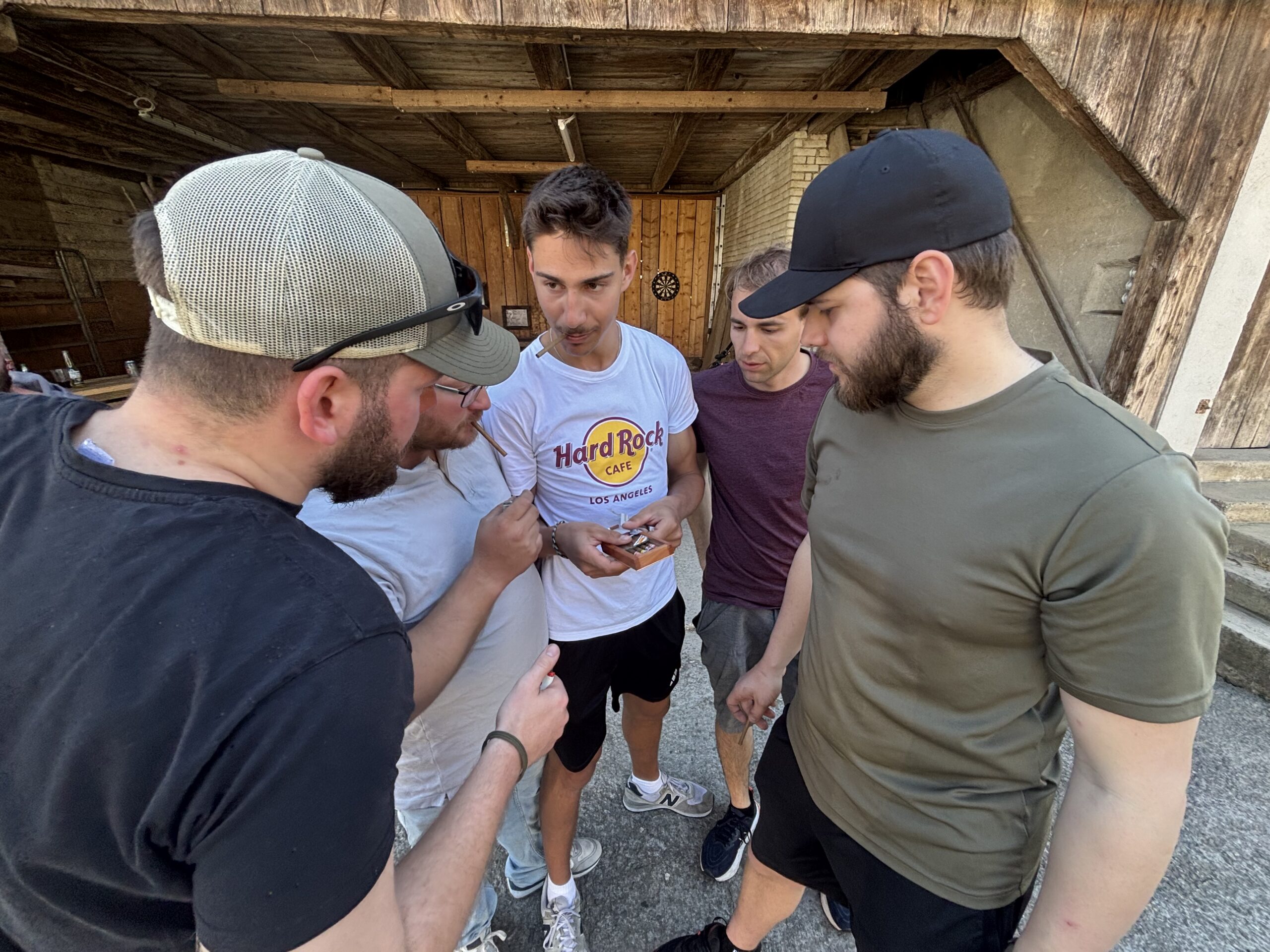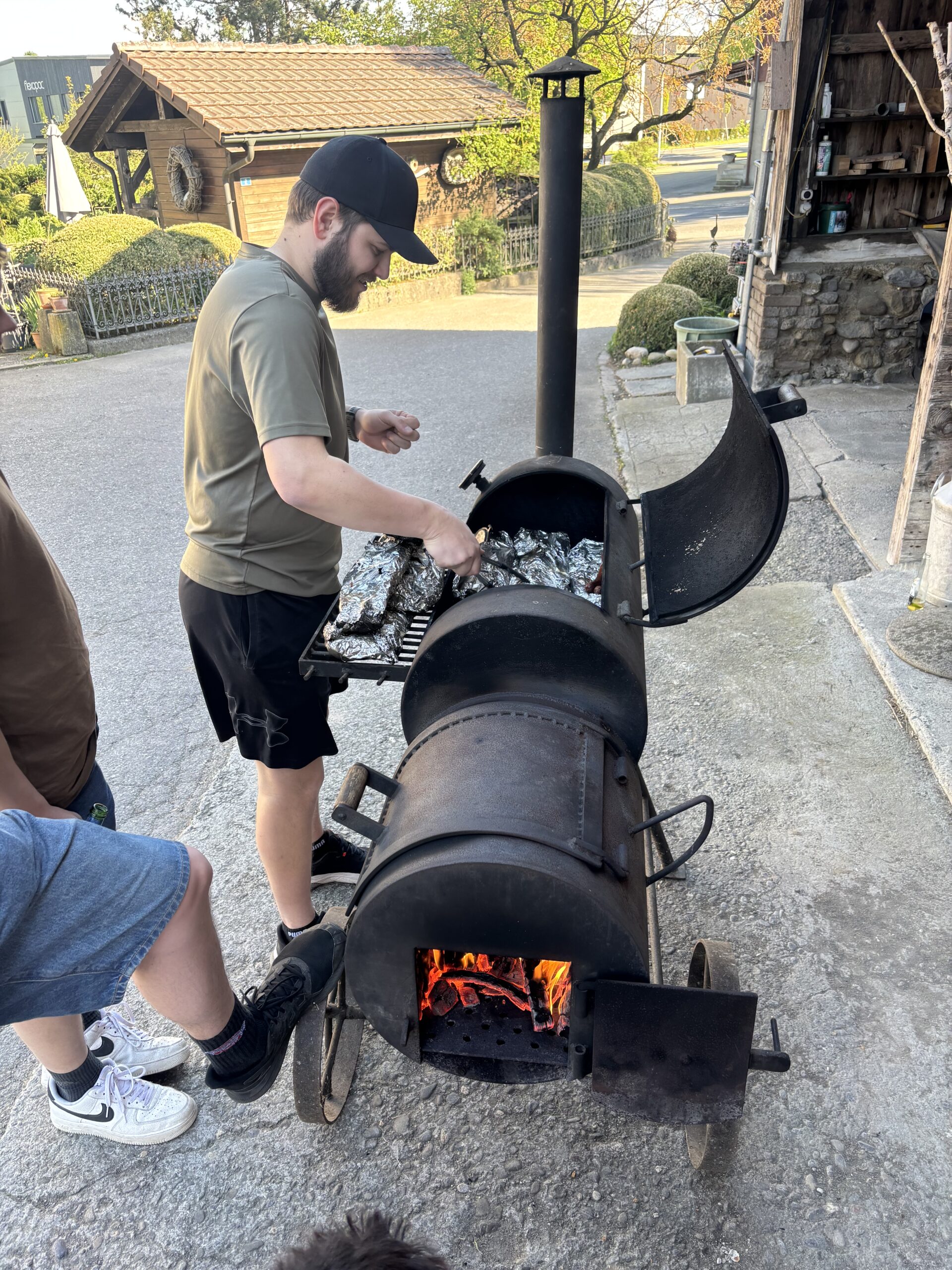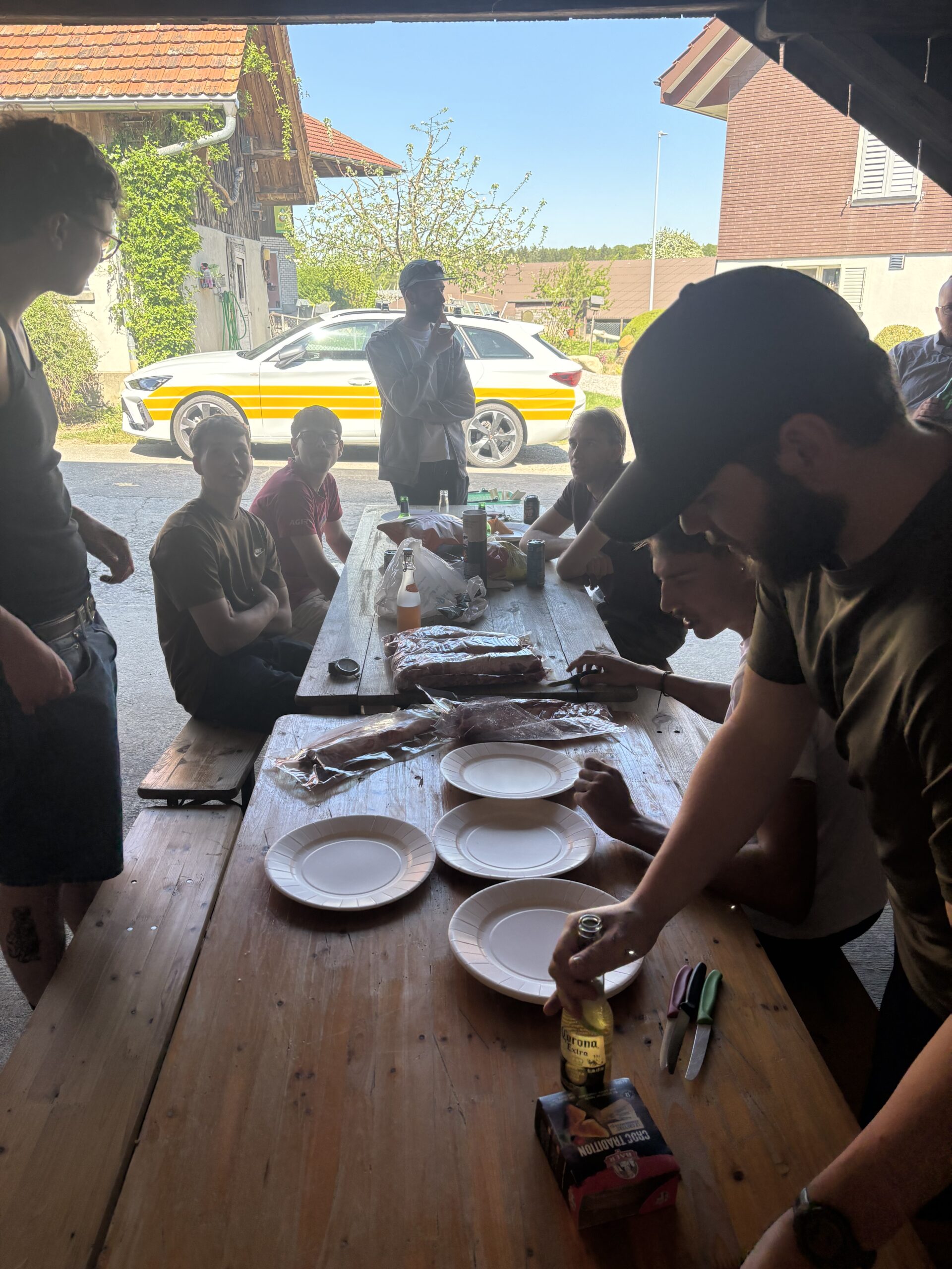 Wir trafen uns um 12:00 beim Mehrzweckgebäude und teilten uns auf drei Autos auf, insgesamt 11 Personen, und fuhren direkt nach Emmen in die Airsoft Arena. Die Fahrt verlief unkompliziert und alle waren schon gespannt auf die Arena. Dort angekommen, spielten wir etwa eine Stunde lang Airsoft, zusammen mit zwei fremden Spielern. Es war taktisch und schnell, deshalb waren wir am Ende ziemlich verschwitzt. Nach dem Spielen fuhren wir wieder zurück nach Auw und gingen zu Aurel nach Hause. Dort angekommen, machten wir es uns zuerst gemütlich und verbrachten Zeit auf dem Hofplatz. Wir spielten Bier Pong und noch ein paar andere lustige Spiele, während die Stimmung immer locker blieb. Ein wenig später marinierten wir die Spareribs. Insgesamt legten wir 7 kg auf den Grill und warteten, bis alles schön durch war. Dazu gab es Kartoffelsalat. Währenddessen wurde weiter gespielt, getrunken und geredet. Als wir mit dem Essen fertig waren, hatte jemand die grossartige Idee, die fahrende Fest-Bank bei Ramon zuhause zu holen. Gesagt, getan: Wir liefen dort hin und fuhren damit zurück auf den Hof von Aurel. Dort liessen wir den Abend entspannt ausklingen mit Qualitativem Coop-Kuchen, paar Bierchen und vielen spannenden Geschichten und dazu ein schöner Sonnenuntergang.