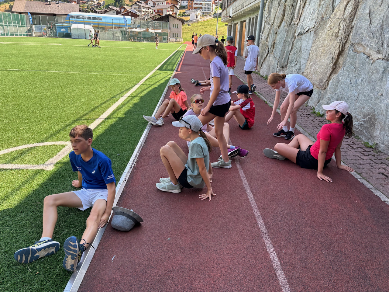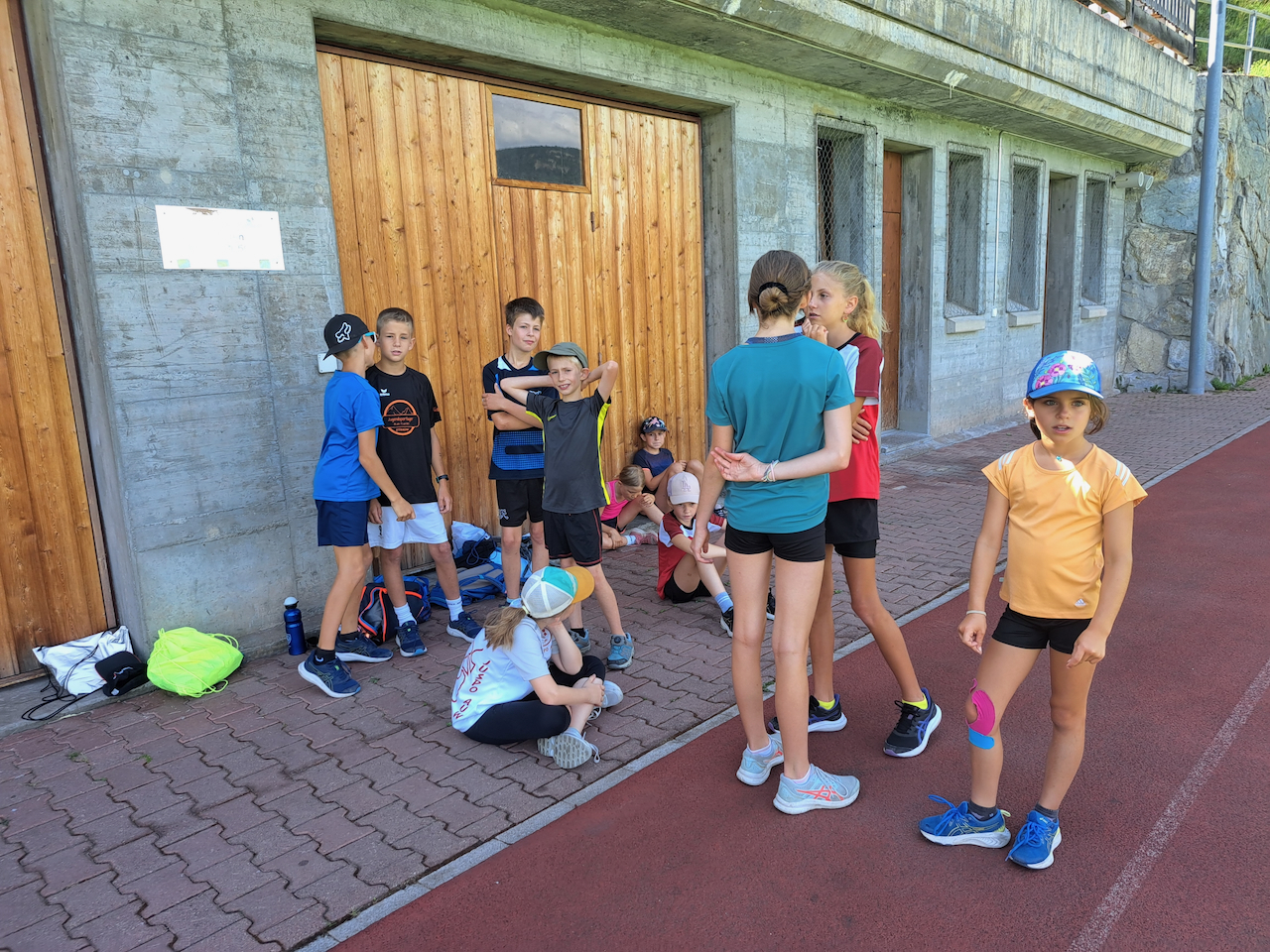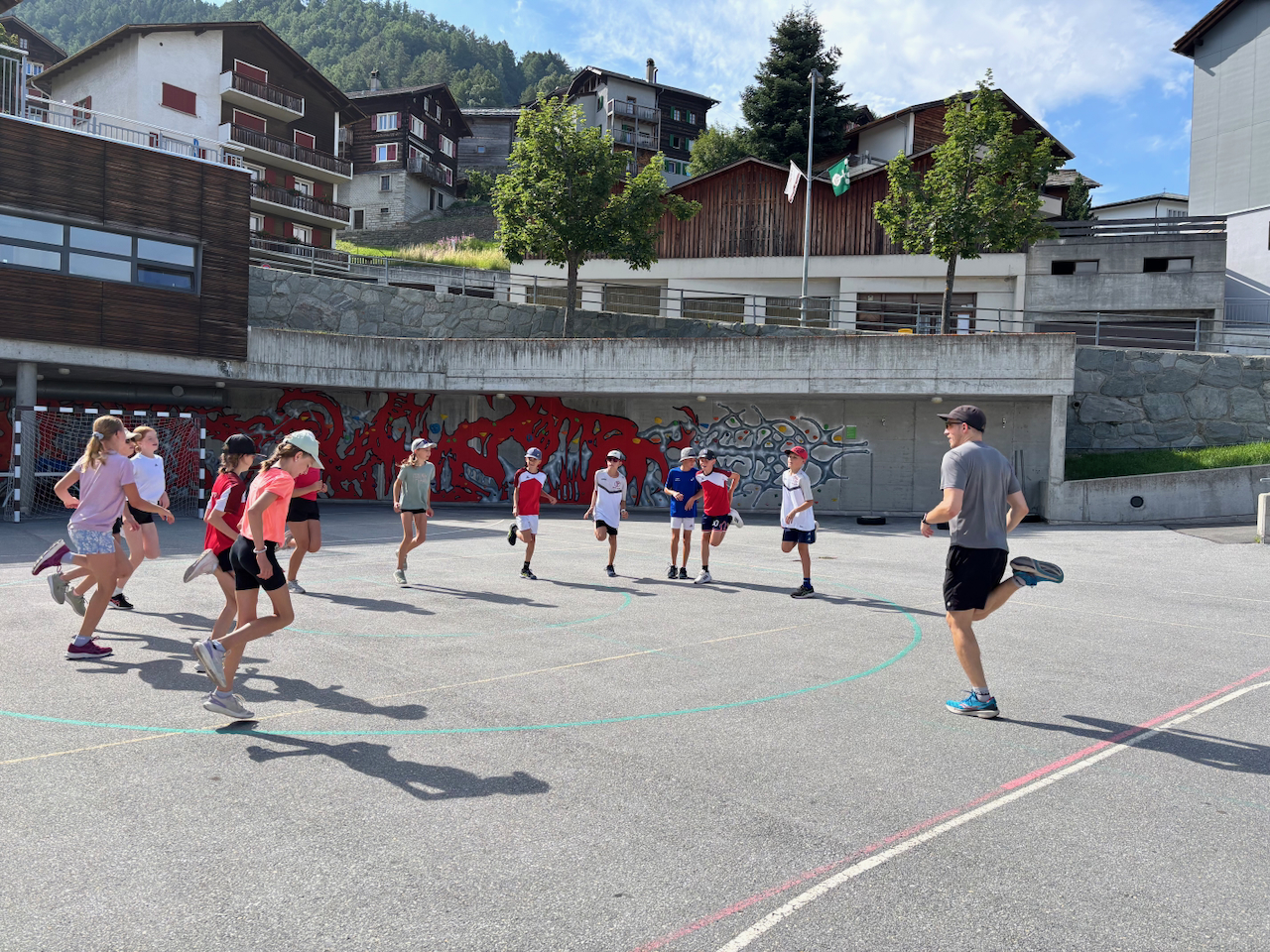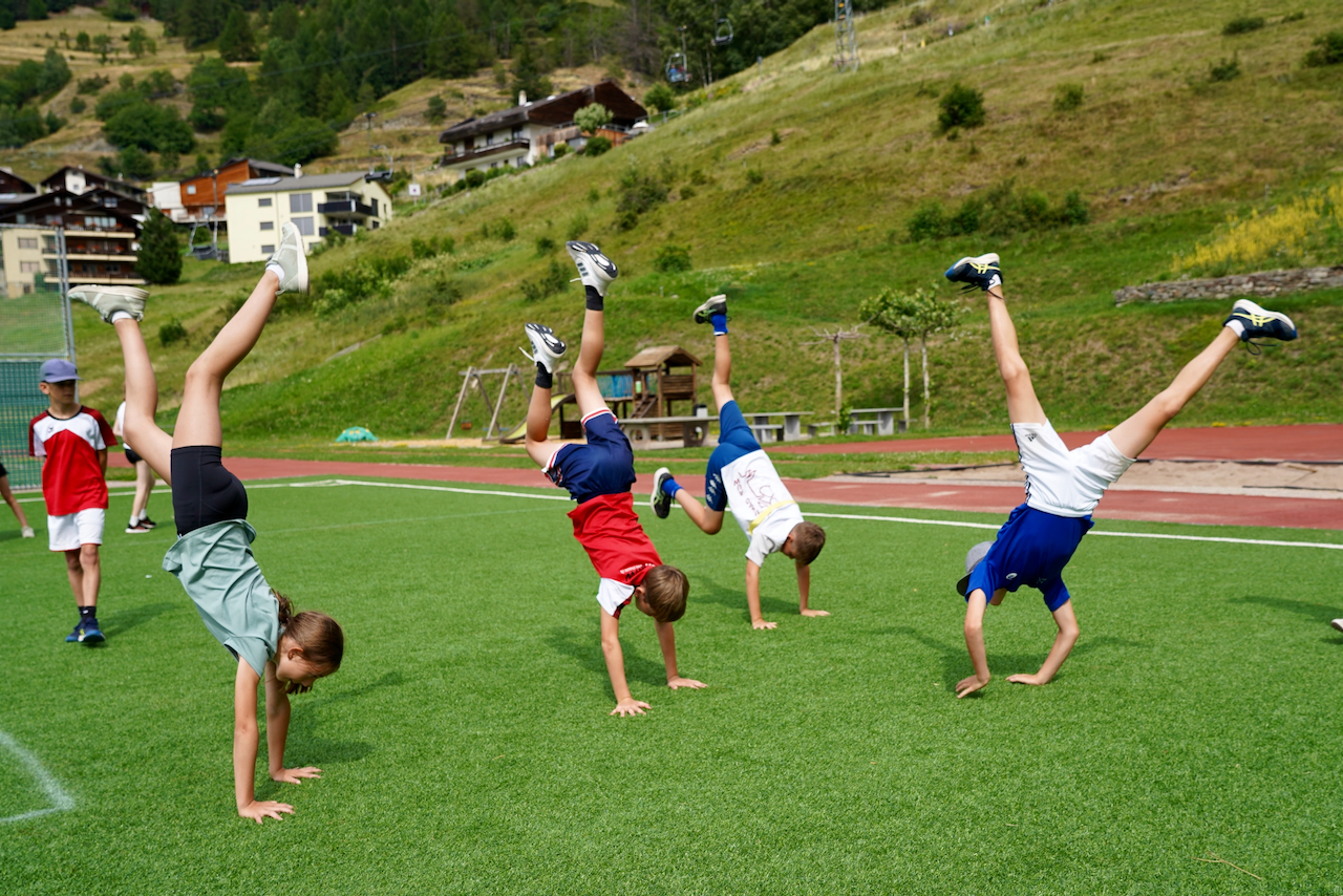Am ersten Morgen trafen sich eine grosse Gruppe zum Morgenjoggen. Im ganze waren es 14 Kinder! Danach gab es ein feines Zmorge. Dann erzählten uns unsere Lagerleiterinnen Jasmin und Vivienne das Morgenprogramm. Mit gefüllten Trinkflaschen, Hut und Sonnencreme gingen alle Gruppen in den ersten Sportblock der Woche. Einige erkundigten Visperterminen, eine Gruppe war in der Turnhalle und eine auf dem Sportplatz. Mit grossem Hunger gab es dann zum Mittagessen Schnipo.