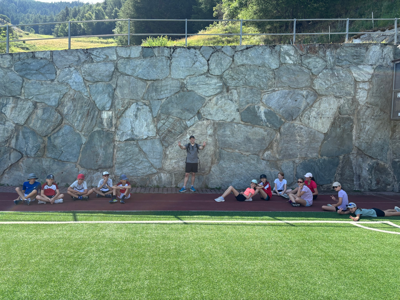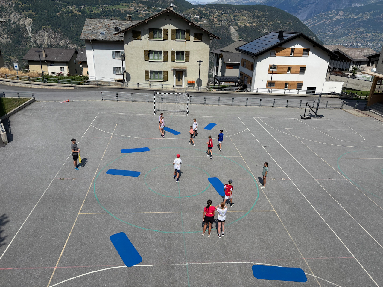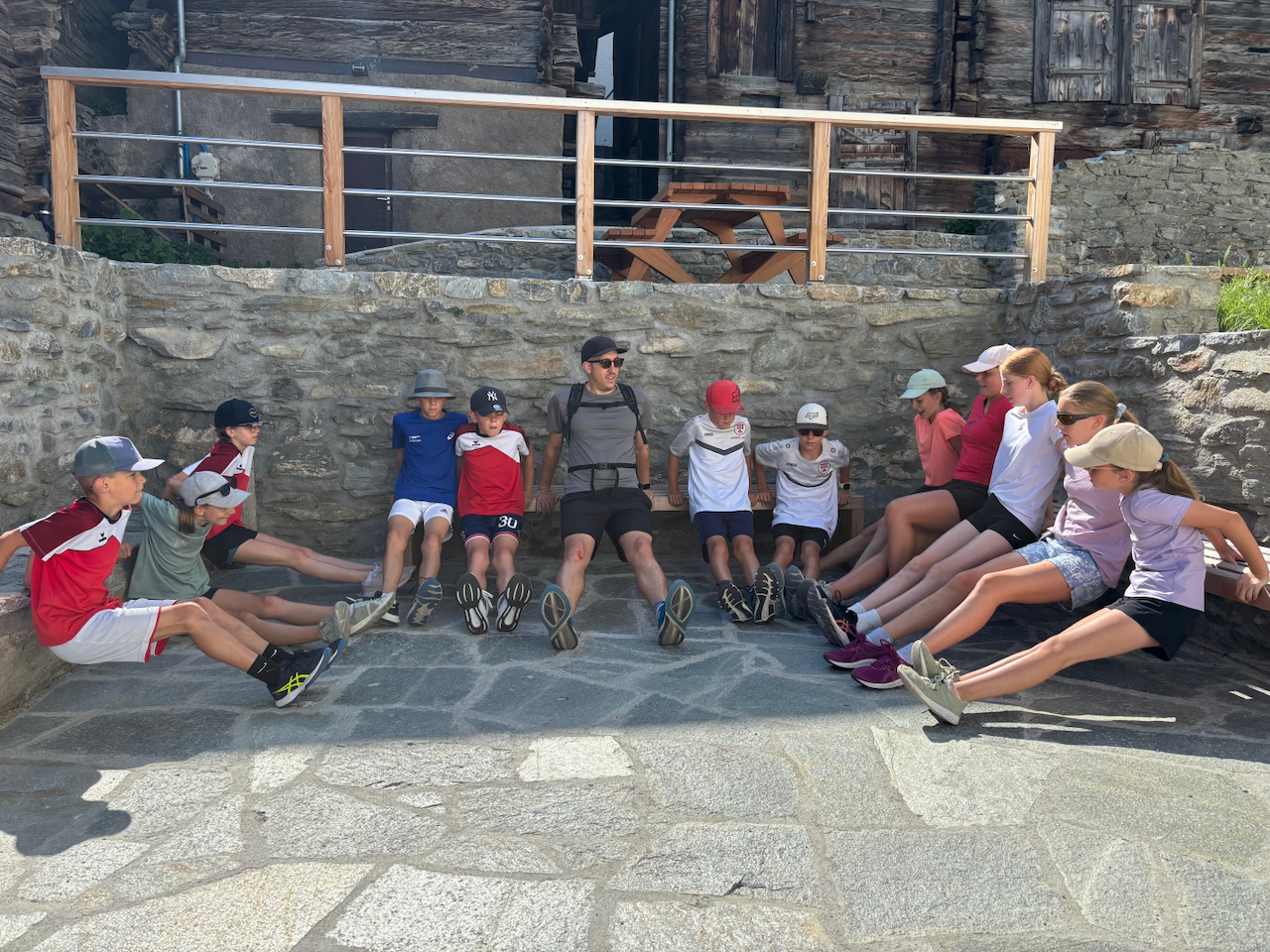 Am ersten Morgen trafen sich eine grosse Gruppe zum Morgenjoggen. Im ganze waren es 14 Kinder! Danach gab es ein feines Zmorge. Dann erzählten uns unsere Lagerleiterinnen Jasmin und Vivienne das Morgenprogramm. Mit gefüllten Trinkflaschen, Hut und Sonnencreme gingen alle Gruppen in den ersten Sportblock der Woche. Einige erkundigten Visperterminen, eine Gruppe war in der Turnhalle und eine auf dem Sportplatz. Mit grossem Hunger gab es dann zum Mittagessen Schnipo.