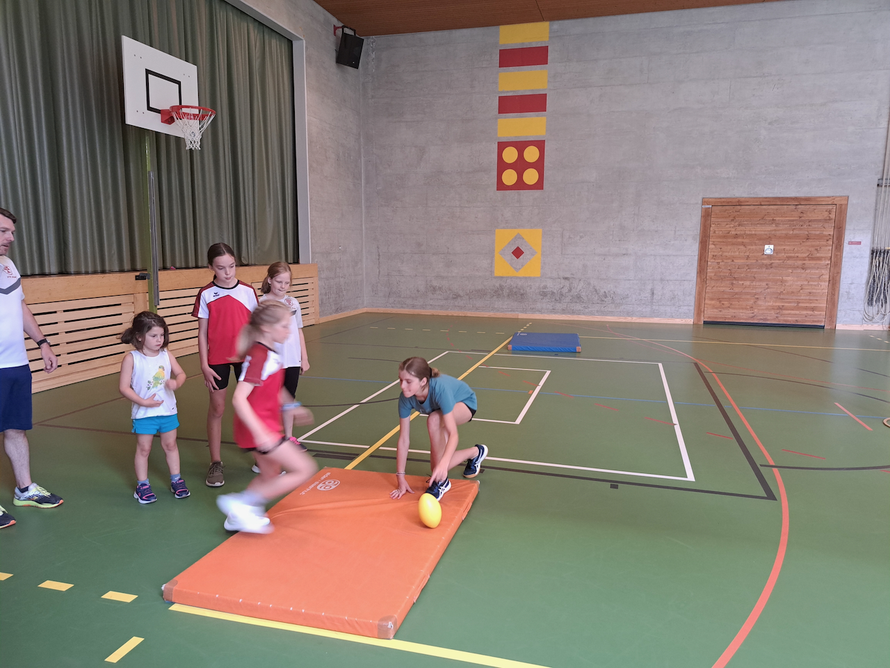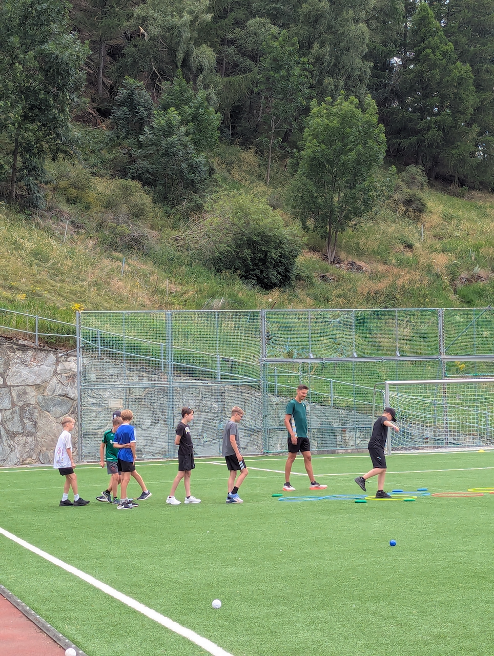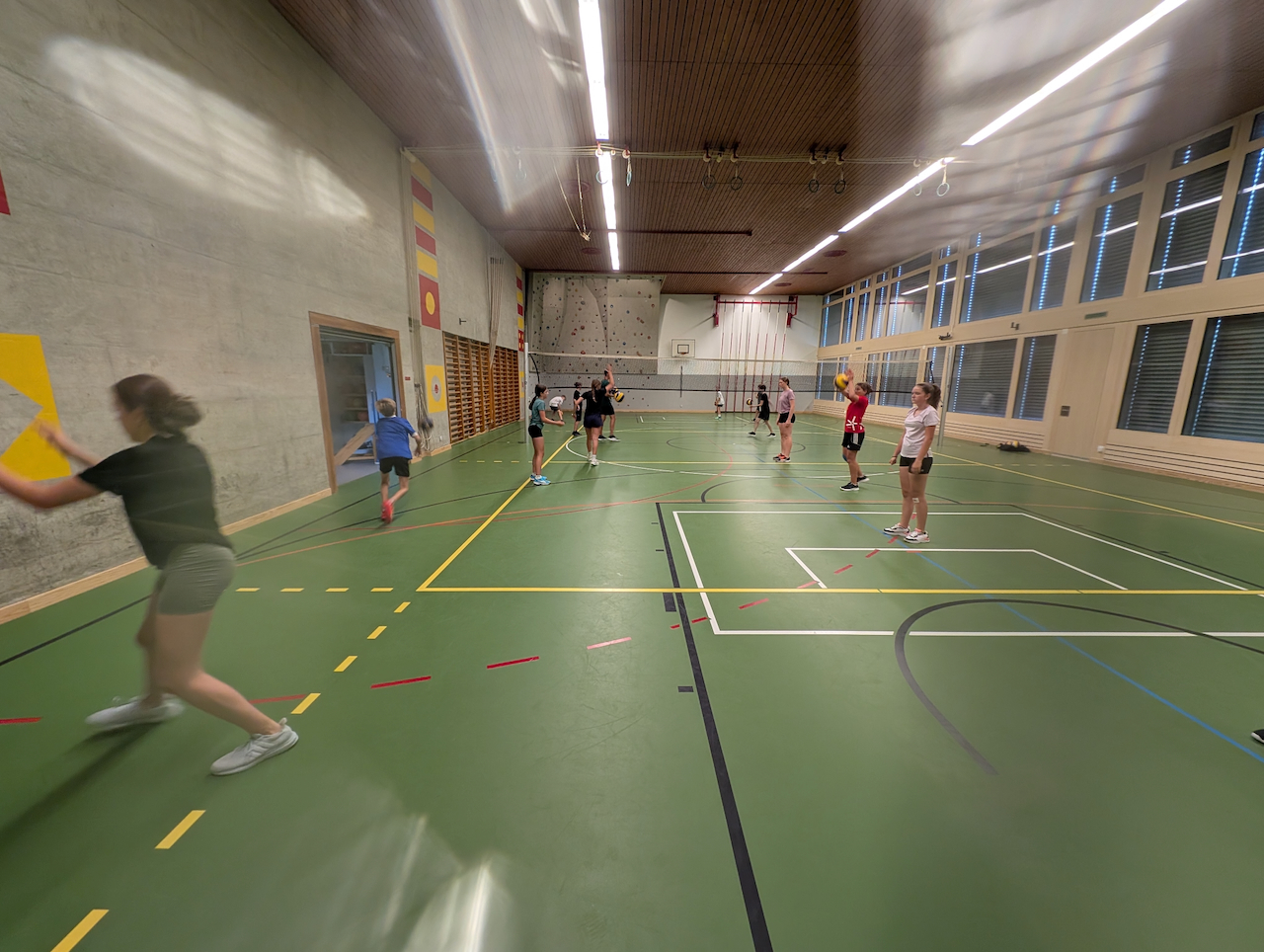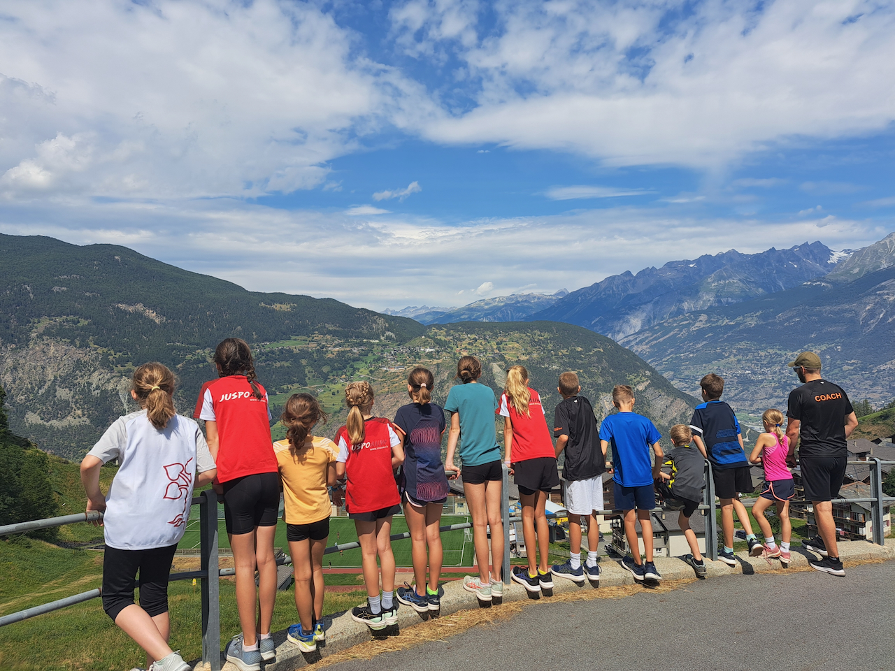 Am ersten Morgen trafen sich eine grosse Gruppe zum Morgenjoggen. Im ganze waren es 14 Kinder! Danach gab es ein feines Zmorge. Dann erzählten uns unsere Lagerleiterinnen Jasmin und Vivienne das Morgenprogramm. Mit gefüllten Trinkflaschen, Hut und Sonnencreme gingen alle Gruppen in den ersten Sportblock der Woche. Einige erkundigten Visperterminen, eine Gruppe war in der Turnhalle und eine auf dem Sportplatz. Mit grossem Hunger gab es dann zum Mittagessen Schnipo.