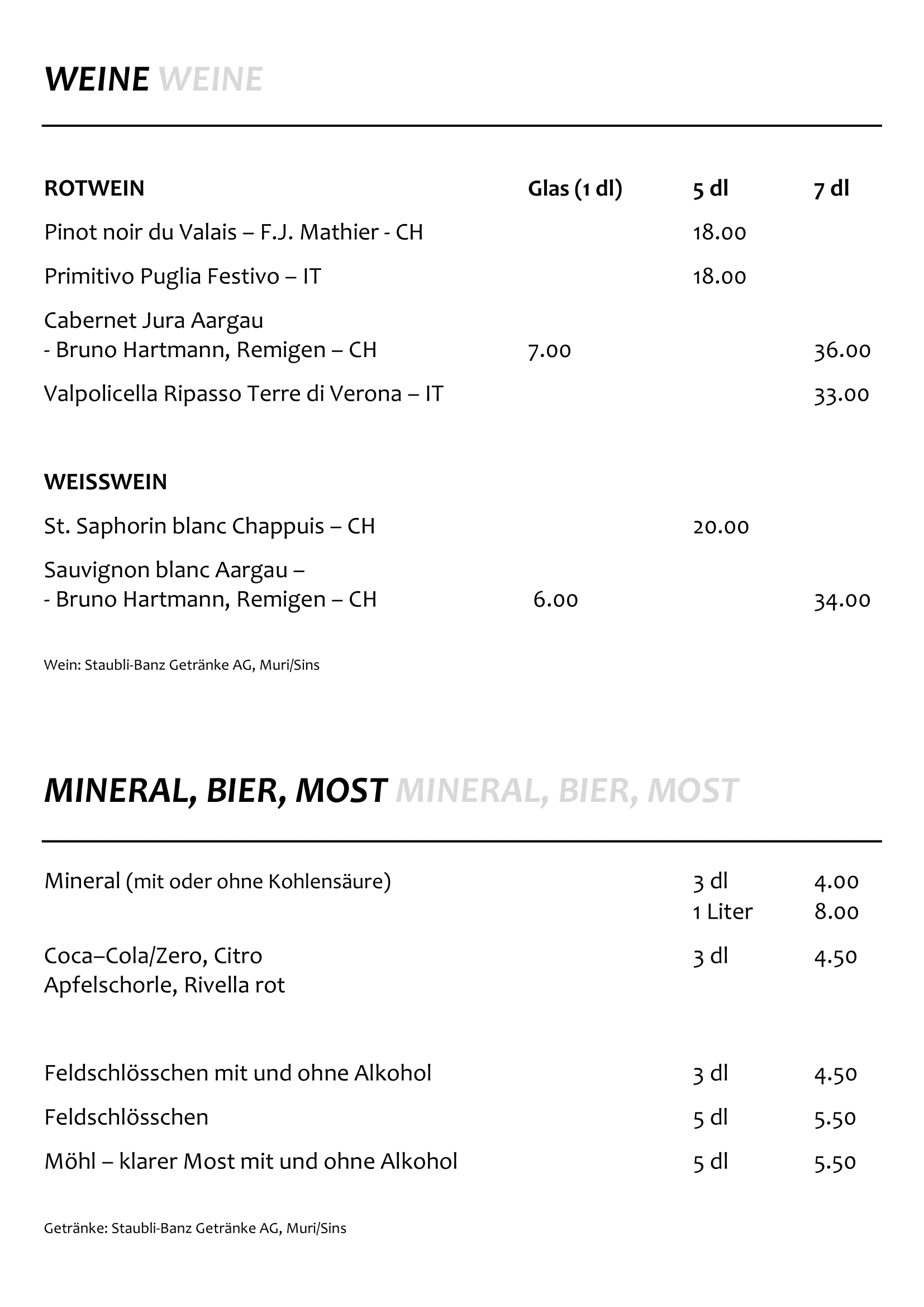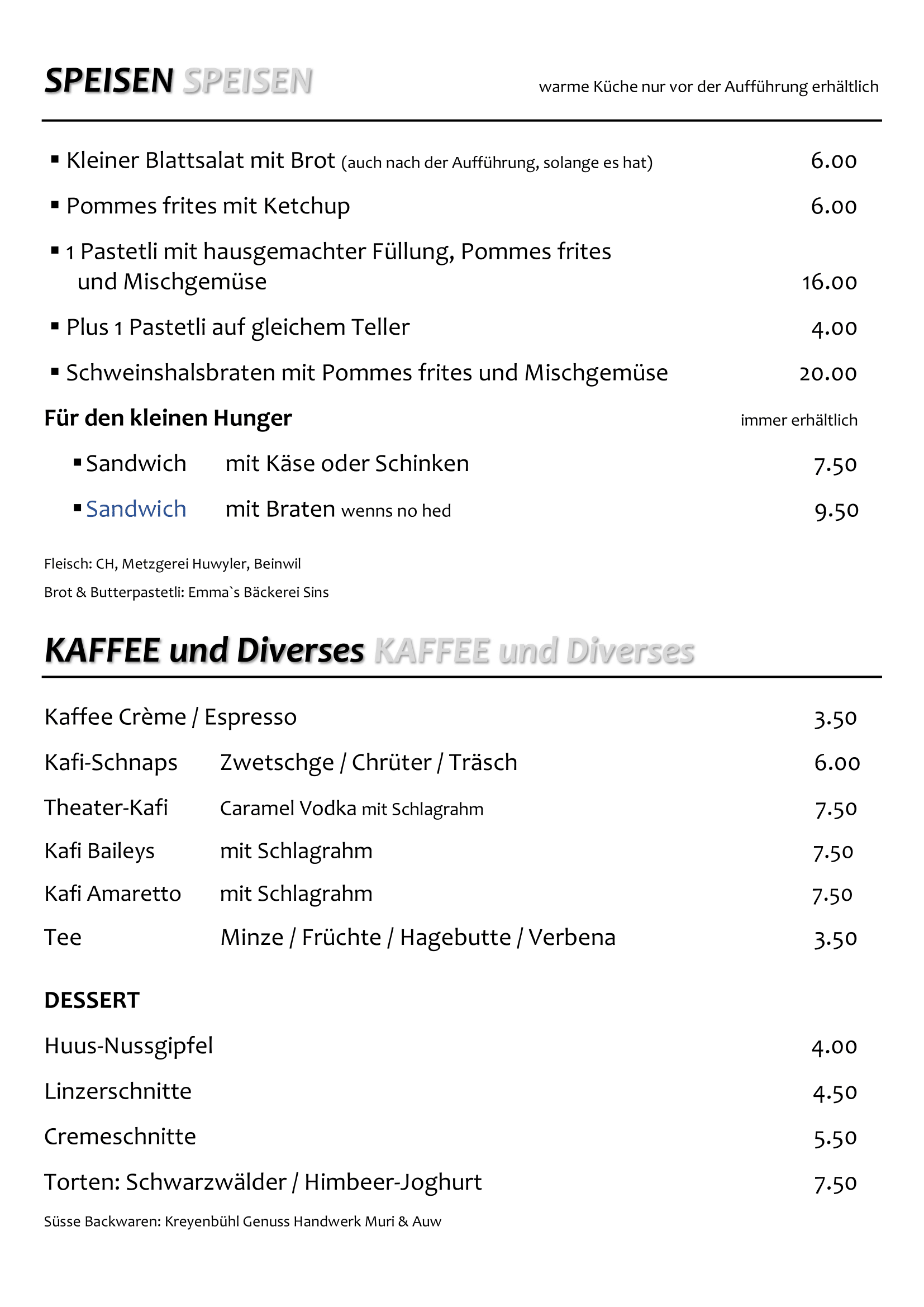 An den Abendaufführungen steht die warme Küche vor der Aufführung (ab 18.30 bis 19.30) zur Verfügung.